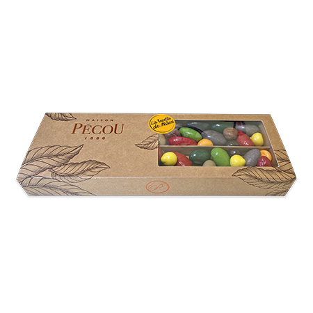 Assortiment de Liquicroc pomme d’Api (Harmonie entre chocolat au lait et pomme caramélisée), Olives du sud (Amandes grillées enrobées de chocolat noir et de chocolat coloré), Chocoviennoises (Amandes grillées enrobées de chocolat noir et dragéifiées), Chocomeringues (Meringues enrobées de chocolats noir, lait et blanc colorés).