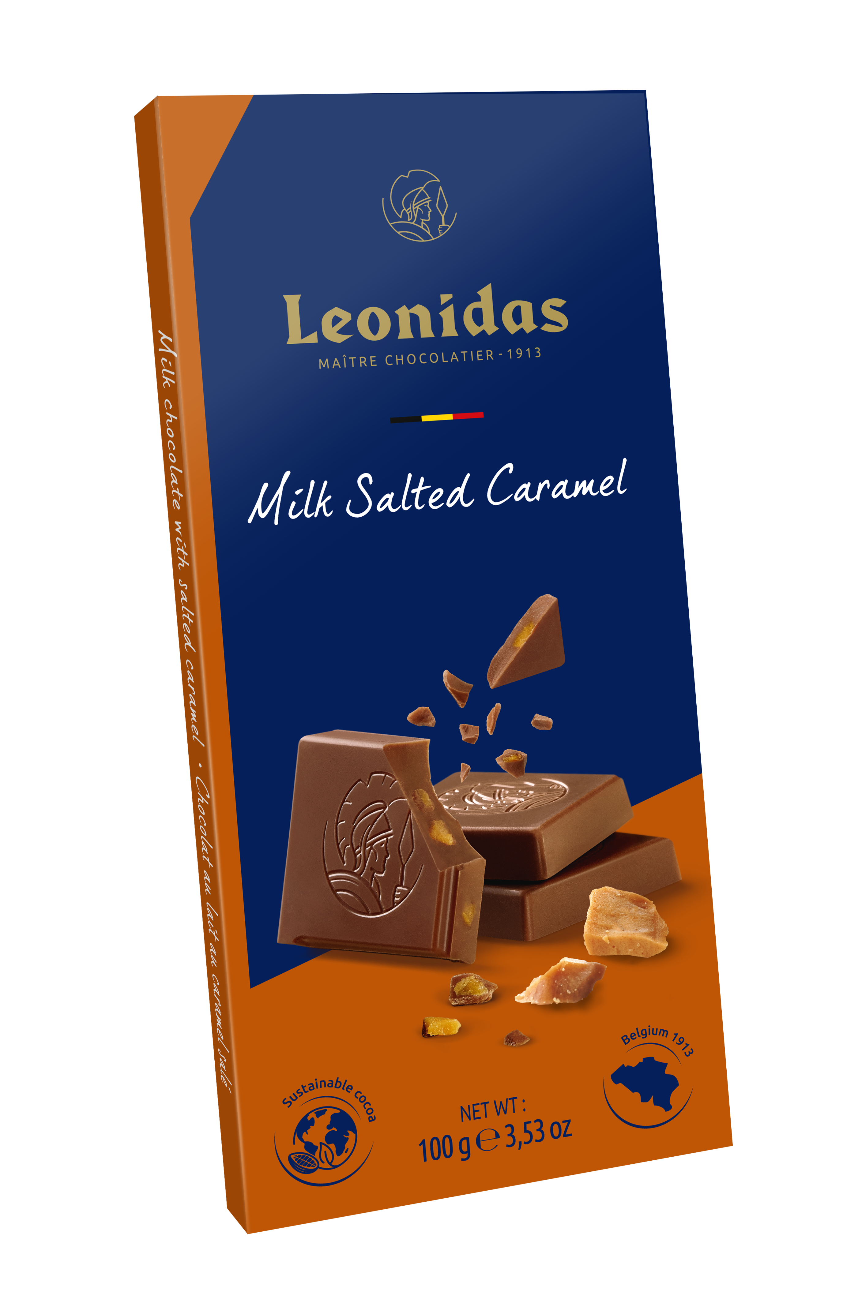 Retrouvez la saveur unique des créations Leonidas dans cette tablette de chocolat au lait caramel, un classique à déguster sans façon. Chocolat au lait et caramel à base de beurre salé d’Isigny (France).